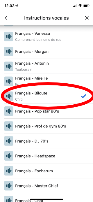Dans la liste des voix descendez sur le français, et cochez “Français -Biloute“.