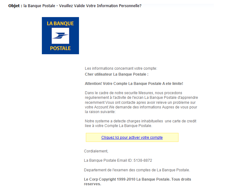 Attention, nous ne sommes bien sûr pas en train de dire que l’intégralité des mails en provenance de votre banque sont une tentative pour dérober vos données personnelles. Mais portez votre attention sur l’expéditeur de ce mail, est-ce bien l’adresse habituelle de votre banque ? De plus, le mail comporte-t-il des fautes d’orthographe qui pourrait trahir les mauvaises intentions de son auteur ?