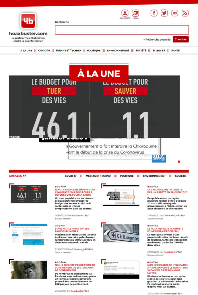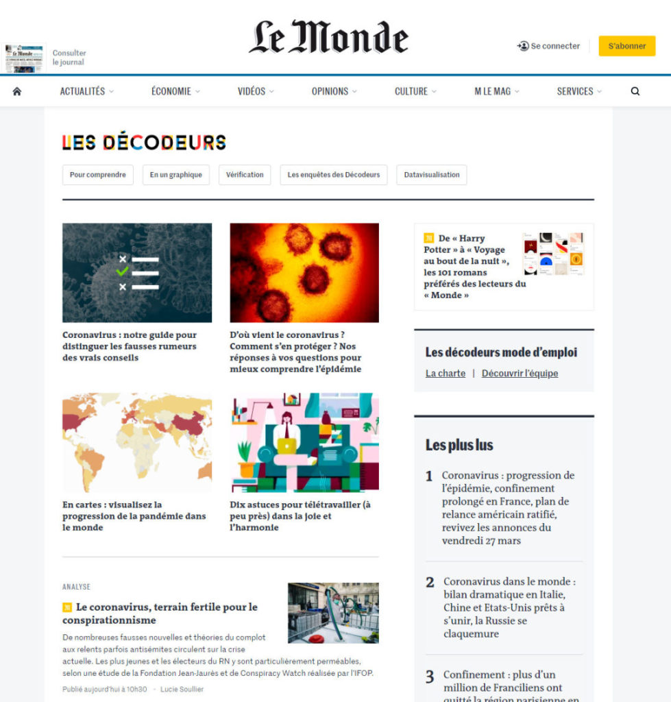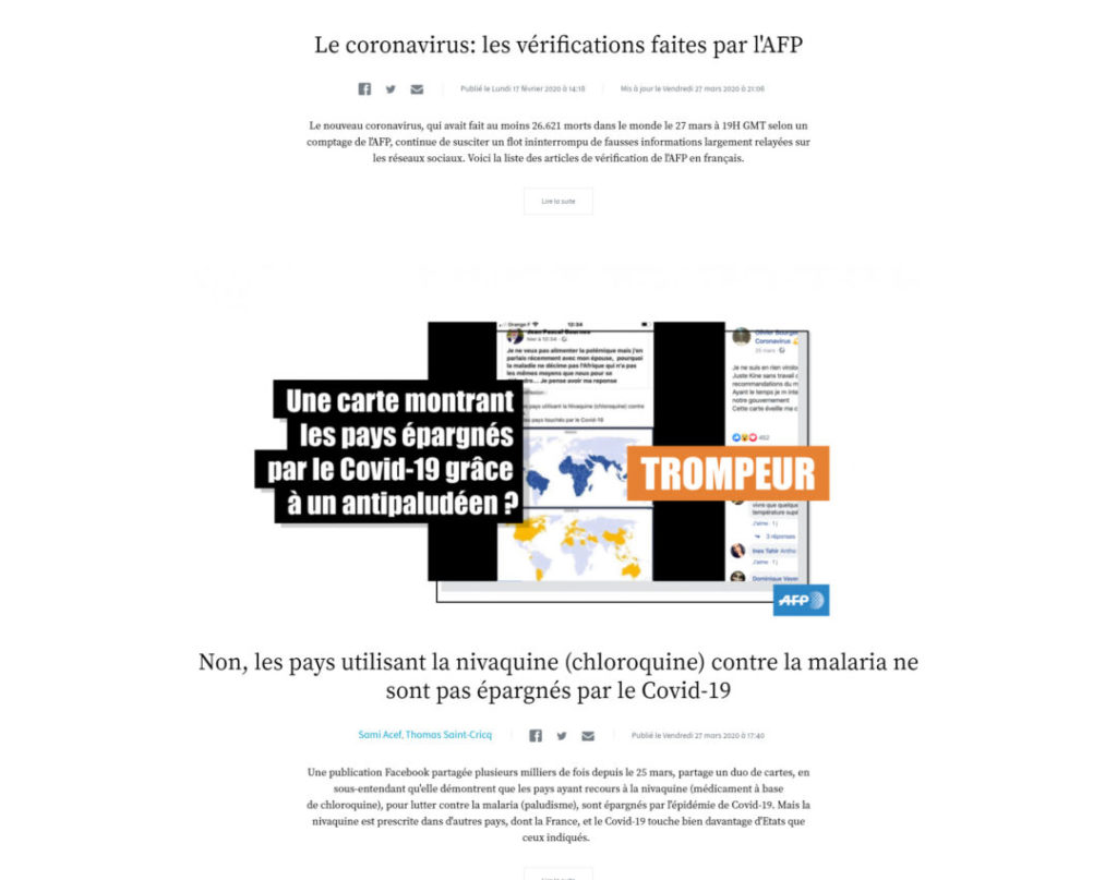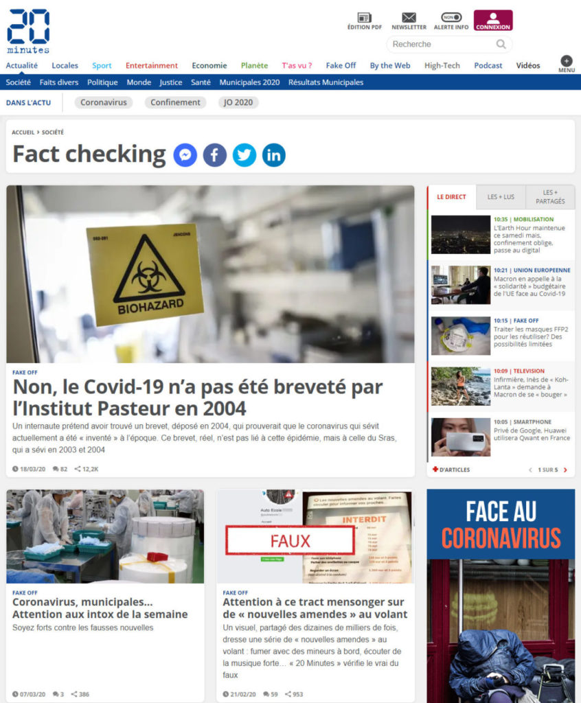 Il y a cet article de France Culture, mais surtout la rubrique « Fact Ckeck » de chez l’AFP ou encore cette page sur 20minutes et aussi « Les Décodeurs » chez Le Monde.