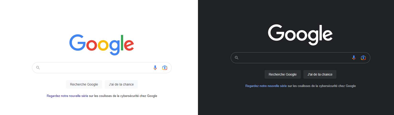 Google sur fond blanc et Google en “dark mode”